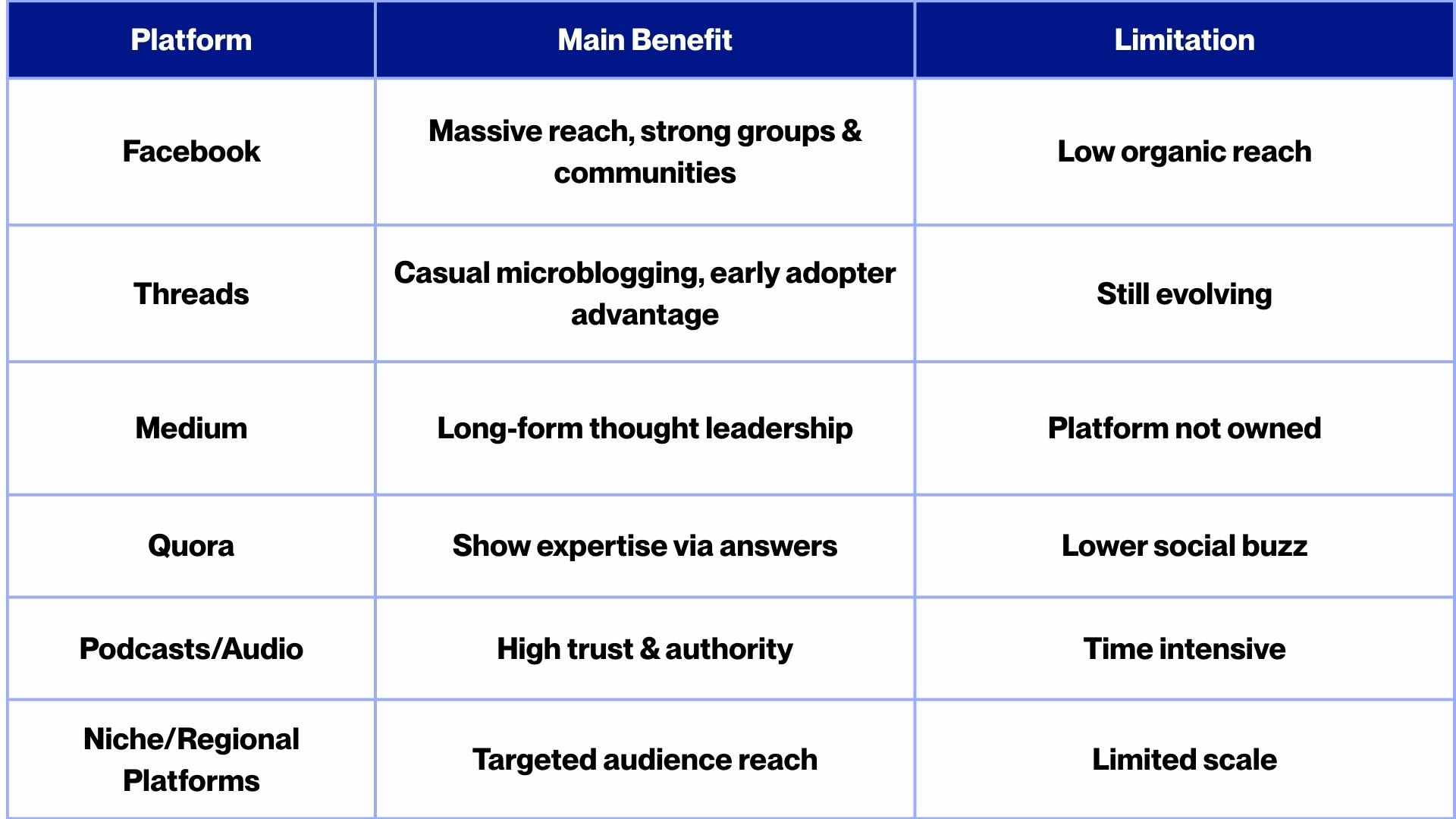 We’ve covered the big five platforms the modern professional typically thinks of, but Facebook (now under Meta) and several other channels still play important roles in personal branding, especially depending on your audience and content style. Facebook is the oldest major network on this list and remains the world’s largest social platform with about 3.0+ billion monthly users. While it may not be as “trendy” as TikTok or as specialized as LinkedIn, Facebook offers unparalleled reach across demographics and strong community-building tools. Alongside Facebook, there are niche or emerging platforms like Threads (Meta’s new microblogging app), Medium (for blogging), Quora (Q&A for demonstrating expertise), Clubhouse or Twitter Spaces (live audio discussions), podcasting platforms, and region-specific networks (such as WeChat/Weibo in China, or Xing in German-speaking countries). Each can contribute to a well-rounded personal brand strategy. Let’s briefly look at Facebook and a few others, their pros, cons, and how they fit in.