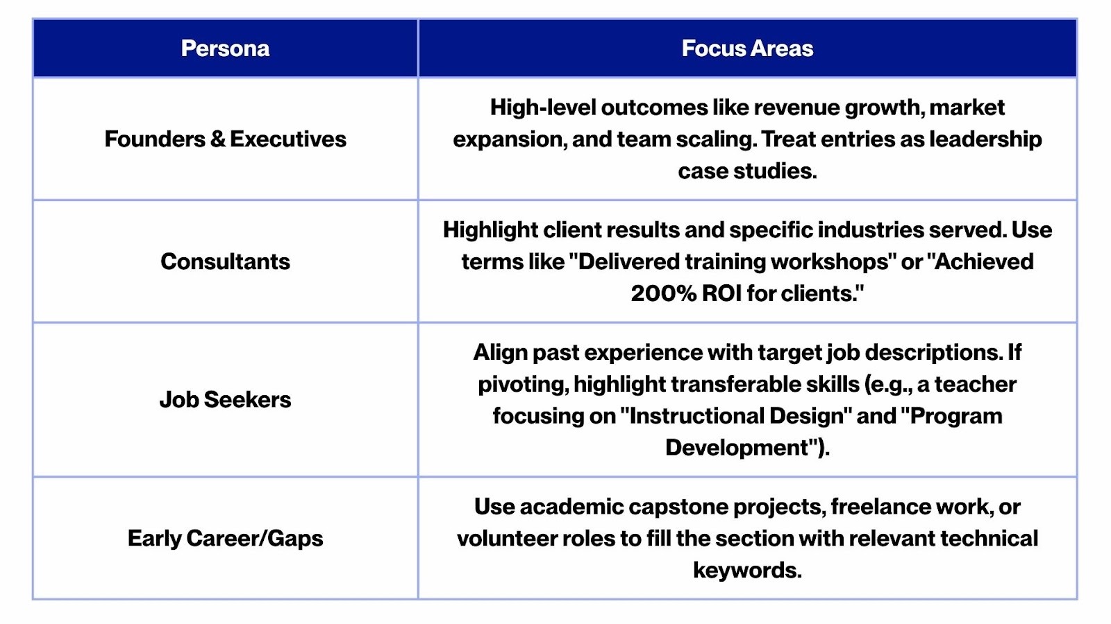 Your Experience section is more than a chronological list of jobs, it is a searchable portfolio. Every role you add is an opportunity to appear in search results. To maximize this, you must optimize each entry for both the algorithm and the human reader.