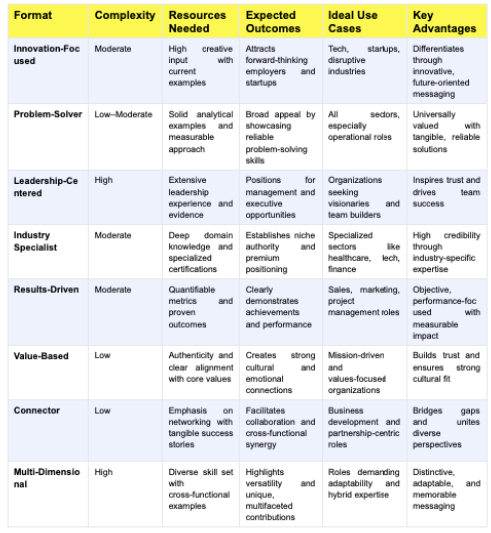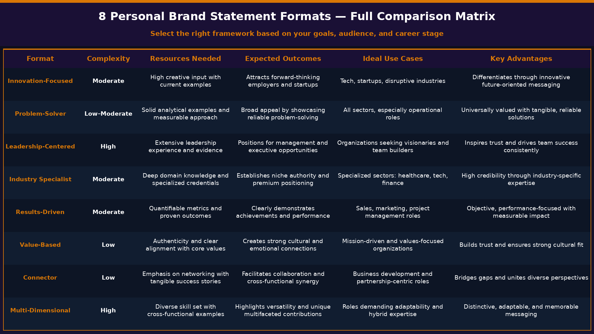 The table below summarizes all eight formats side by side, a quick reference for choosing the right Personal Brand Strategy Examples approach for your goals, audience, and career stage.