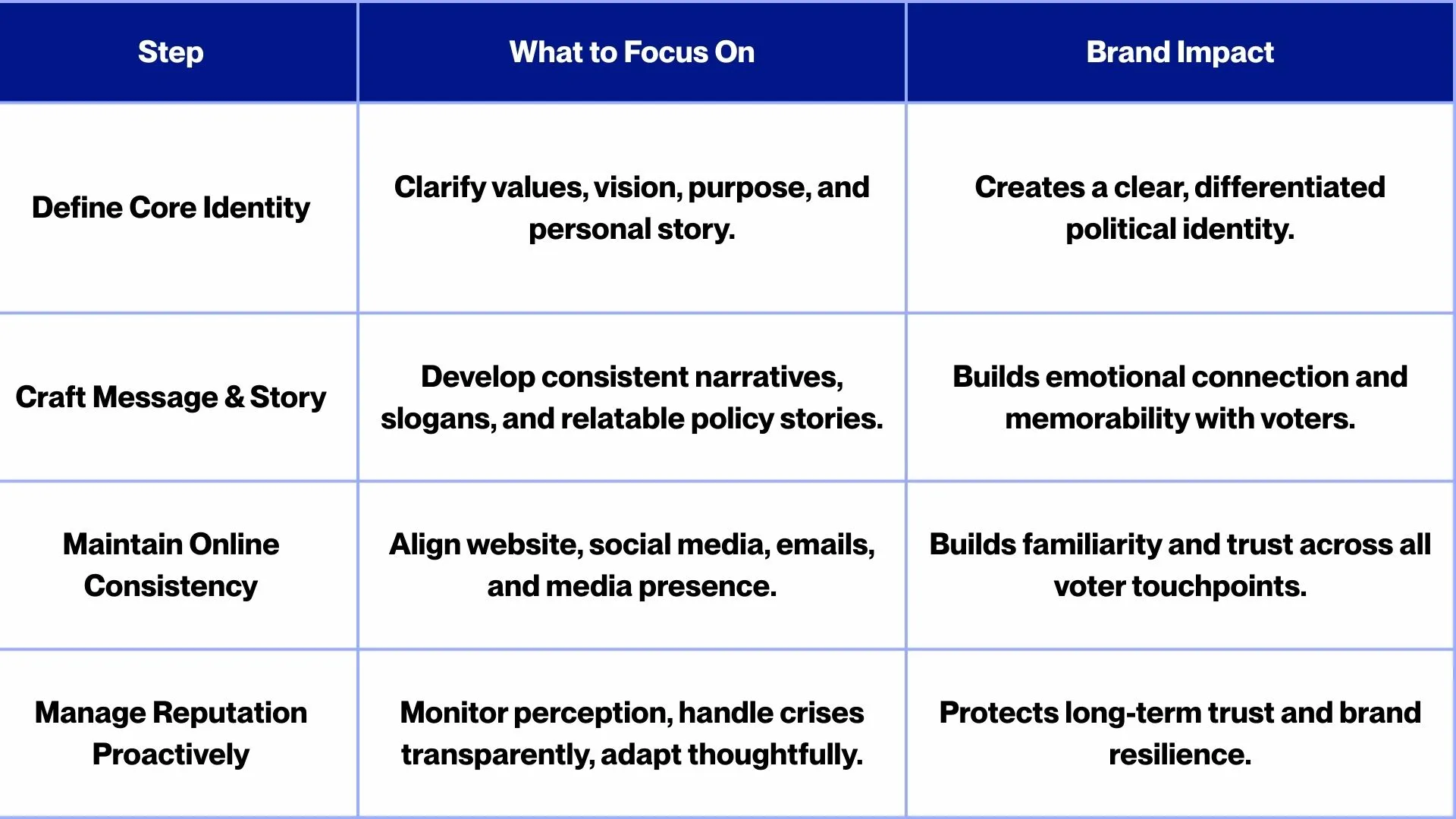 A clear personal brand helps condense a complex political profile into an easy-to-remember identity. Voters might not remember every policy detail, but they will remember the impression a candidate makes. Strong branding often boils down to a simple, resonant concept, such as being the reformer or the unity candidate. Voters should be able to describe a candidate in just three words thanks to a bright, clear brand identity. Having this clarity not only makes a candidate more memorable, but also communicates what makes them unique at a glance.